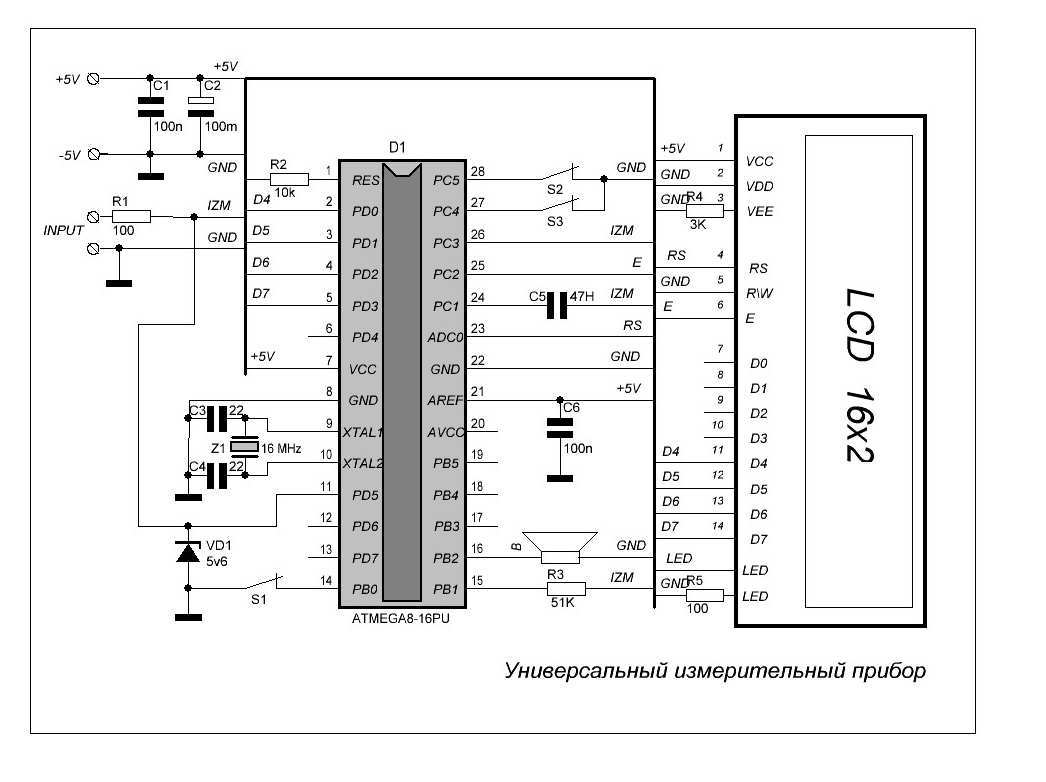 Автор разработки: Электродыч Схема принципиальная Универсальный измерительный прибор "АВО-2006"Частотомер, генератор, осциллограф, измеритель емкости и сопротивленияПри монтаже индикатора смотрите описание, выводы питания бывает по разному ! Нужно соединить 20 и 21 ноги микроконтроллера! R2 сажать на +5В. Кнопки нормально - разомкнуты. Конденсатор С5 термостабильный! Функциональные возможности * Наличие функции измерение частоты с возможностью изменения времени измерения и выводом значение частоты и длительности на дисплей. * Наличие функции генератора с возможностью изменение частоты во всем диапазоне с шагом 1-100 Гц и выводом значение частоты и длительности на дисплей. * Наличие функции осциллограф – позволяющей визуализировать форму сигнала и измерить его амплитудное значение. * Наличие функции измерения емкости позволяет измерять емкость во всем диапазоне * Наличие функции измерения сопротивления позволяет измерят во всем диапазоне * Наличие функции измерения напряжения в режиме осциллограф * Наличие режима автокалибровки в режимах измерения емкости и измерения сопротивления * Наличие входного универсального разъема для подключения кабеля для всех пяти режимов работы. * Наличие символьного дисплея с подсветкой размером 2 строки по 16 символов. * Наличие трех кнопок управления: «кнопка переключения режимов3»-3, «кнопка увеличения значения параметра»-1 и «кнопка уменьшения значения параметра»-2. Технические характеристики Простая и легко повторяемая схема! Диапазон измерения частоты Гц 0.1-15000000 Диапазон генерации частоты Гц 0-100000 Количество точек по горизонтали для осциллографа Шт 16 Количество точек вывода по вертикале для осциллографа Шт 8 Диапазон чувствительности входа осциллографа В 3-5 Диапазон измерения емкости мкФ 0.00001 – 2000 Диапазон измерения сопротивления ОМ 1 - 200000000 Напряжение питания В 5 Рабочая температура оС 0 - +60 Размеры мм 150х150х50 Порядок работы Включить прибор на экране дисплея временно (1 Сек) появится сообщение «Измерение R» и прибор перейдет в режим измерения сопротивления. Переход из одного режима в другой осуществляется циклически при помощи кнопки переключения режимов «3» в порядке: «Измерение R», «Измерение С», «Осциллограф», «Генератор», «Частотомер». При переходе из режима в режим осуществляется кратковременная индикация названия режима. В режиме «Генератор» изменение частоты генерации происходит кнопками «1» - (увеличение частоты) и «2» (уменьшение частоты). В режиме «Осциллограф» кнопками «1» и «2» производится изменение времени развертки, измерение уровня сигнала происходит автоматически с индикацией его значения. В режимах «Измерение емкости С» и «Измерение сопротивления R» переключение диапазонов измерения происходит автоматически. Калибровка нуля (в режиме измерения "R" соединить щупы, в режиме "С" разъединить щупы) в этих режимах происходит нажатием и удержанием кнопки «1»,с последующей записью в память кнопкой «2» до появления "OK". Калибровка для "R" осуществляется по номиналу 1000 ом, для "С" 1000пф нажатием и удержанием кнопки «2» с последующей записью в память кнопкой «1». От точности этих калибровочных элементов будит зависеть точность прибора во всем диапазоне! Изменение время измерения частоты осуществляется кнопкой «1», позволяющей измерять частоту с точностью до 0.1 Гц. Само время измере