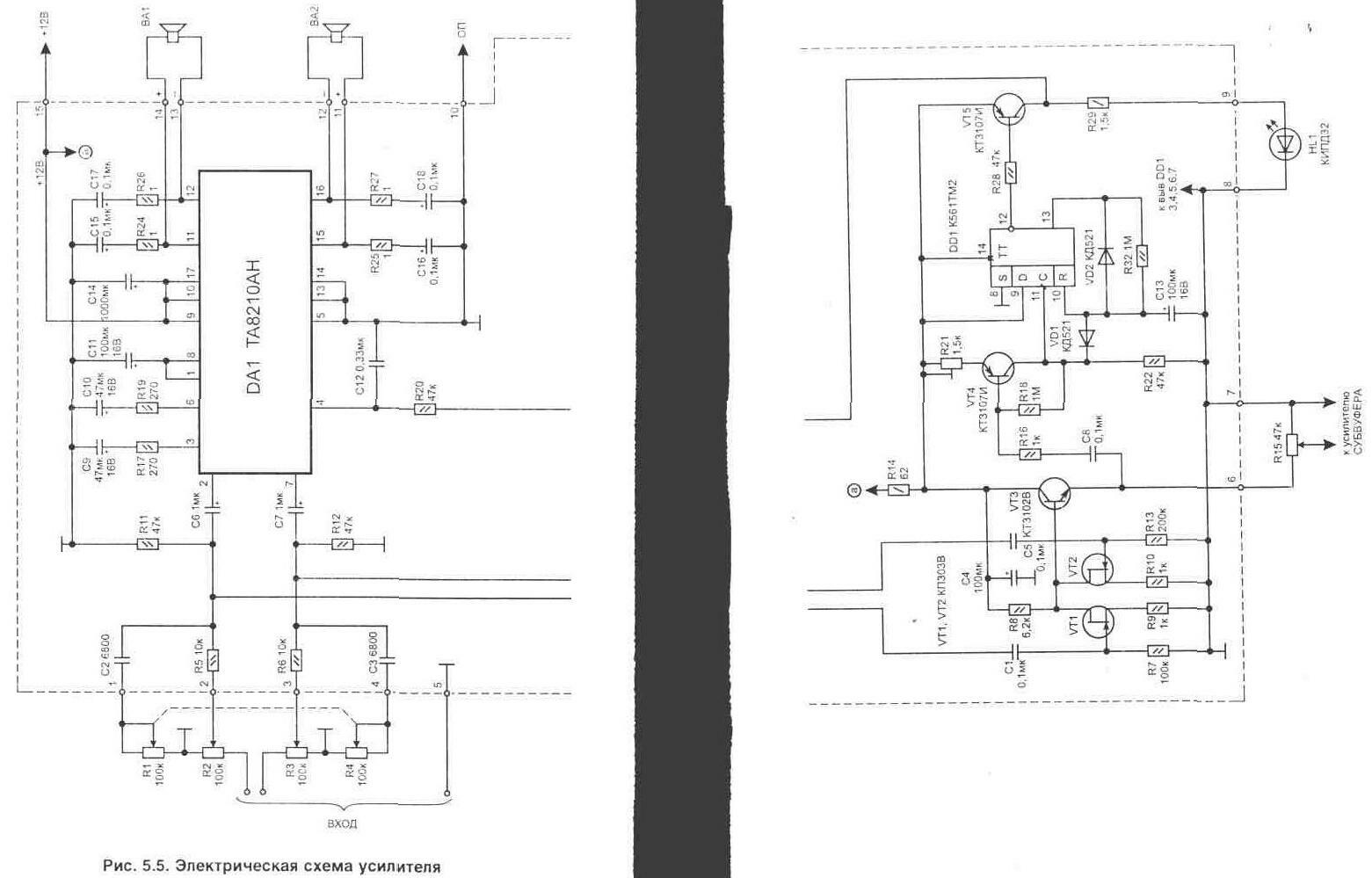 Схема принципиальная Высококачественный звуковой усилитель для компьютераИспользуя современную импортную элементную базу, не сложно самостоятельно собрать высококачественный звуковой усилитель. Потребуется всего одна микросхема фирмы TOSHIBA. При этом не нужна настройка, которая подразумевает наличие дорогостоящих измерительных приборов. Электрическая схема такого усилителя приведена на рис. 5.5. Для его изготовления выбрана микросхема ТА8205АН в типовом включении. Обычно она применяется в аппаратуре Hi-Fi класса благодаря малым нелинейным искажениям. Подойдут также аналогичные, но более мощные: ТА8210АН и ТА8215АН (схема подключения в этом случае не меняется). В отличие от многих других типов, кроме низкого коэффициента нелинейных искажений в микросхеме предусмотрена работа в дежурном режиме, т.е. с пониженным потреблением тока от источника в случае подачи на вход DA1/4 нулевого уровня. Кроме того, в усилителе обеспечивается мягкое включение, что устраняет щелчки в колонках при подаче питания.