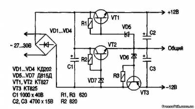 Схема принципиальная Двуполярное питание из обыкновенногоПри конструировании различных усилителей мощности ЗЧ радиолюбители довольно часто сталкиваются с проблемой отсутствия двуполярного источника питания. Схема, изобиженная на рис.1, позволяет получить из обыкновенного питания двуполярное, кроме того, она сама по себе является стабилизатором. На вход можно подавать напряжение как переменное, так и постоянное, в последнем случае диоды VD1-VD4 можно исключить, но при этом при подключении придется соблюдать полярность.