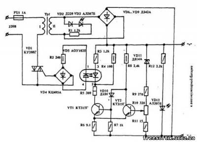 Схема принципиальная Автоматическое зарядное устройствоПредлагаю несложное автоматическое зарядное устройство для аккумуляторных батарей. Зарядка батарей прекращается при достижении на клеммах напряжения выше 12,5 В.