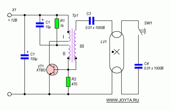 Точками показаны начало обмоток. Сначала наматываем третью обмотку, затем к выводу третьей обмотки прикрепляем вывод второй обмотки и наматываем ее в обратную сторону. Затем, обмотав хорошенько эти две обмотки лакотканью, наматываем первую обмотку. Транзистор необходимо разместить на радиаторе - алюминиевая пластина площадью не менее 20 см2, которая будет служить теплоотводом. Кнопка 1 служит для поджога лампы, если этого не произошло сразу, но обычно лампы зажигаются сами. После того как собрали все воедино проверьте еще раз монтаж. Не допустили ли вы ошибок в монтаже. Если ошибок нет, то подключайте лампу, а затем подавайте питание (Не наоборот! Иначе трансформатор может пробить!). Если лампа не загорается, то поменяйте местами выводы обмотки I. Перебросьте концы обмотки - генерация должна возникнуть. Если опять не загорается проверьте транзистор.