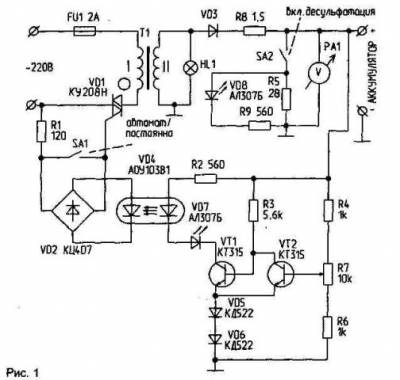 Схема принципиальная Зарядно-десульфатирующий автоматДавно уже известен тот факт, что заряд электрохимических источников питания асимметричным током, при соотношении Iзар : Iразр = 10:1, в частности кислотных аккумуляторов, приводит к устранению сульфатации пластин в батарее, т.е. к восстановлению их емкости, что, в свою очередь, продлевает срок службы батареи.Не всегда есть возможность находиться возле зарядного устройства и все время контролировать процесс зарядки, поэтому зачастую либо систематически недозаряжают батареи, либо перезаряжают их, что, конечно же, не продлевает срок их службы. Из химии известно, что разность потенциалов между отрицательной и положительной пластинами в аккумуляторной батарее составляет 2,1 В, что при 6 банках дает 2,1 х 6 = 12,6 В. При зарядном токе, равном 0,1 от емкости батареи, в конце заряда напряжение повышается до 2,4 В на одну банку или 2,4 х 6 = 14,4 В. Повышение зарядного тока ведет к повышению напряжения на аккумуляторе и повышенному разогреву и кипению электролита. Заряд же током ниже 0,1 от емкости не позволяет доводить напряжение до 14,4 В, однако длительный (до трех недель) заряд малым током способствует растворению кристаллов сульфата свинца. Особенно опасны дендриты сульфата свинца, "проросшие" в сепараторах. Они и вызывают быстрый саморазряд батареи (с вечера зарядил аккумулятор, а утром не смог запустить двигатель). Вымыть же дендриты из сепараторов можно только растворением их в азотной кислоте, что практически нереально. Путем длительных наблюдений и экспериментов была создана электрическая схема, которая, по мнению автора, позволяет довериться автоматике. Опытная эксплуатация в течение 10 лет показала эффективную работу устройства. Принцип работы заключается в следующем: 1. Заряд производится на положительной полуволне вторичного напряжения. 2. На отрицательной полуволне происходит частичный разряд батареи за счет протекания тока через нагрузочный резистор. 3. Автоматическое включение при падении напряжения за счет саморазряда до 12,5 В и автоматическое отключение от сети 220 В при достижении напряжения на батарее 14.4 В. Отключение — бесконтактное, посредством симистора и схемы контроля напряжения на батарее. Важное достоинство метода заключается в том, что пока не подключена батарея (автоматический режим), блок не может включиться, что исключает короткое замыкание при замыкании проводов, подводящих зарядный ток к аккумуляторной батарее. При сильно разряженной батарее включение блока возможно посредством переключателя "АВТОМАТ-ПОСТОЯННО". Еще одно очень важное достоинство — отсутствие сильного "кипения", что в совокупности с автоматическими отключением и включением позволяет оставлять включенное устройство без присмотра на длительное время. Автор про-экспериментировал с двухнедельным режимом постоянного включения в режиме "АВТОМАТ". В целях пожарной безопасности необходимо, чтобы зарядное устройство было в металлическом корпусе, сечение подводящих проводников к батарее — не менее 2,5 мм2. Обязателен также надежный контакт на клеммах батареи. Напряжение сети 220 В подается через предохранитель FU1 и симис-тор VD1 на первичную обмотку силового трансформатора. Со вторичной обмотки переменное напряжение U2=21 В выпрямляется диодом VD3 и через балластный резистор R8 сопротивлением 1,5 Ом пост