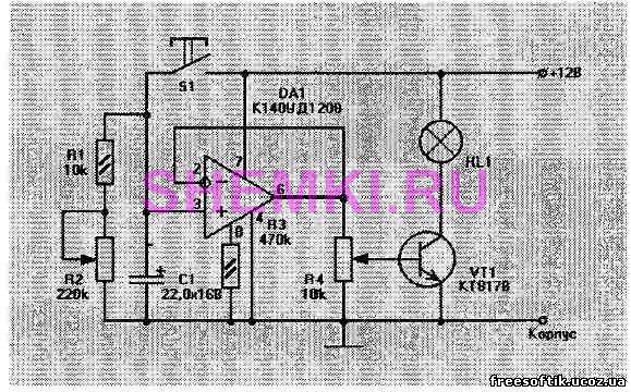 Автор разработки: Ю.Серов Схема принципиальная Автомат освещения салонаУстройство, описание которого приведено ниже, позволяет сделать освещение салона вашего автомобиля более удобным. Обычно, когда автомобильная дверца закрывается, плафон в салоне сразу гаснет. Используя устройство, схема которого приведена на рисунке, можно получить эффект медленного изменения яркости свечения лампы плафона от обычного освещения до полного погасания за несколько минут. Такое выключение плафона дает дополнительное преимущество ночью и выглядит очень романтично. Принцип действия схемы очень прост. Когда автомобильная дверца открыта, выключатель S1, расположенный в дверце, замкнут, конденсатор С1 заряжается, и напряжение на нем равно напряжению аккумуляторной батареи. Микросхема DA1 выполняет роль усилителя постоянного тока (УПТ) с коэффициентом передачи 1. Обладая высоким входным сопротивлением, она не разряжает С1. Напряжение на выходе DA1 равно напряжению на входе. Высокое напряжение на выходе микросхемы через резистор R3 поступает на базу VT1, транзистор открыт, лампа HL1 светится в полный накал. Когда дверца закрывается, дверной выключатель разрывает цепь заряда конденсатора С1, и начинается медленный разряд конденсатора через цепочку R1 - R2. Напряжение на нем плавно уменьшается. Следовательно, напряжение на выходе DA1 также уменьшается, уменьшая ток базы транзистора VT1. Это приводит к изменению коллекторного тока, и нагрузка VT1 - лампа плафона - медленно гаснет. Наконец, когда конденсатор почти полностью разряжен, транзистор закрывается, и лампа гаснет. Конструкция устройства может быть любой. После проверки монтажа подключите устройство к источнику питания и, замкнув кнопку S1 резистором R3, установите начальную яркость свечения лампы HL1. Разомкните кнопку S1 и потенциометром R2 установите необходимое время угасания HL1.