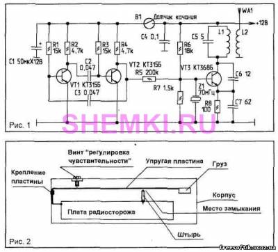 Автор разработки: Н.Мартынюк Схема принципиальная Автомобильный радиосторожВ связи с ростом числа автомобилей и отдаленностью гаражей от квартир актуальным стал вопрос охраны машин в ночное время во дворах домов. Если угнать автомобиль довольно сложно, то снять эмблему, вытащить магнитолу или аккумулятор не составляет большого труда. Большинство противоугонных устройств усложняют только запуск мотора автомобиля, но не защищают от хищения содержимого. Есть устройства, срабатывающие на качание, исполнительным узлом которых является сирена или автомобильный сигнал. В ночное время они будят не только хозяина, но и соседей. Отключение аккумулятора полностью выводит такие устройства из строя. От всех перечисленных недостатков свободен предлагаемый радиосторож. Рассмотрим его работу. Радиосторож состоит из высокочастотного генератора, модулятора и датчика качания. В дежурном режиме датчик качания разомкнут, и питание подается только на генератор. Приемник, находящийся в квартире, настраивается на несущую частоту генератора по пропаданию шумов в громкоговорителе. Таким образом, даже при отключении аккумулятора срабатывание радиосторожа определяется по резкому возрастанию шумов, и это также является признаком исправности линии "машина — квартира". При прикосновении к автомобилю кратковременно замыкается датчик качания B1. Через ее контакты подается питание на модулятор и заряжается конденсатор С1. После размыкания контактов датчика питание модулятора осуществляется от конденсатора до следующего замыкания. Напряжением затухающих низкочастотных колебании с выхода модулятора осуществляется модуляция высокочастотного генератора. При этом в приемнике раздается громкий прерывистый сигнал тревоги. Частота высокочастотного генератора определяется частотой кварца (3..5 гармоники) и находится в диапазонах 64...75 МГц или 88...108 МГц для европейского стандарта. Катушка L1 имеет 6 витков провода ПЭЛ 0,6 на каркасе диаметром 6 мм. Катушка связи L2 — 2 витка ПЭЛ 0,3. Радиус действия радиосторожа из салона автомобиля без подключенной антенны — до 50 м. Несколько таких устройств были испытаны в работе в течение 2 лет и показали надежную работу. Источник: Н.Мартынюк, журнал "Радиолюбитель". Схемы и статьи публикуются с разрешения редакции журнала.