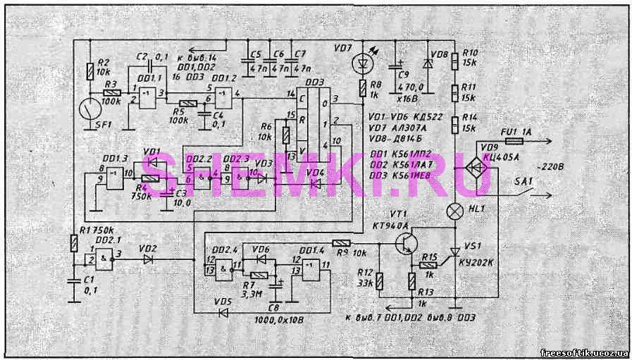 Автор разработки: Д.Лаевский Схема принципиальная Автовыключатель света в подсобных помещенияхПредлагаемый автоматический выключатель освещения имеет улучшенный алгоритм работы. Свет включается в момент открывания двери при входе, а выключается в момент закрывания при выходе, т.е. человек все время находится в освещенном помещении. Таймер отключения ограничивает время свечения лампочки, например, если дверь случайно оставили открытой. При входе в помещение на короткое время, дверь часто оставляют открытой. В этом случае, если дверь не закрывают в течение нескольких секунд, при выходе и закрывании двери свет погаснет автоматически.Принципиальная схема автовыключателя приведена на рисунке. При закрытой двери магнит, закрепленный на ней, воздействует на контакты геркона SF1. прикрепленного к косяку напротив магнита. При открывании двери контакты SF1 размыкаются и логическая "1" через подавитель импульсов дребезга DD1.1, С2, R3 поступает на формирователь DD1.2, С4. R5, который формирует короткие импульсы положительной полярности по фронту и спаду входного. Эти импульсы проходят на вход счетчика DD3. Весь алгоритм работы устройства можно разделить на четыре такта: 1. Дверь открыли, свет включился; 2. Зашли в помещение, дверь закрыли, свет горит; 3. Дверь открыли, свет горит; 4. Вышли из помещения, дверь закрыли, свет гаснет. При первых трех тактах на выводе 3 DD3 присутствует логический "0", который разрешает через инвертор DD2.4 работу таймера отключения на элементе DD1.4 и открывает транзистор VT1. Тиристор VS1 открывается, включается свет. Примерно через 1 час конденсатор С8 зарядится, на выходе DD1.4 появится логическая "1", сбрасывающая счетчик DD3. Свет гаснет. Если из помещения вышли раньше, логическая "1" с вывода 10 DD3 через диод VD4 сбрасывает счетчик и свет гаснет. В случае если при входе дверь оставили открытой, то через 10 секунд зарядится конденсатор СЗ. При последующем закрывании двери элементы DD2.2 и DD2.3 сформируют импульс сброса счетчика DD3 и свет выключится. Устройство на элементе DD2.1 устанавливает счетчик DD3 в начальное состояние при включении блока в сеть. Светодиод VD7 закреплен в косяк двери снаружи и сигнализирует о включенном освещении. Мощности резисторов R10, R11, R14 выбраны с запасом, на них рассеивается в сумме менее 1 Вт. При длительной работе они должны быть теплыми (это необходимо контролировать только при обесточенном устройстве). Блокировочные конденсаторы С5...С7 необходимо разместить в непосредственной близости от каждой микросхемы. Пару магнит-геркон удобнее всего использовать от охранной сигнализации, но, в принципе, подойдет любой геркон с нормально разомкнутыми контактами. При отсутствии магнита и геркона их можно заменить любой кнопкой. Вместо тиристора VS1 можно применить КУ202 с буквами К, Л, М, Н или КУ201 с буквами К, Л. Диодный мост VD9 можно заменить на КЦ405 с буквами А, Б, В, Г, И, Ж. Стабилитрон VD8 подойдет любой с напряжением стабилизации 8...10 В. Автовыключатель работоспособен при колебаниях напряжения 180...240 В. Устройство имеет бестрансформаторное питание, все цепи гальванически связаны с сетью, поэтому при сборке и эксплуатации необходимо соблюдать осторожность, не касаться элементов при включенном блоке. Прикрепления: Картинка 1