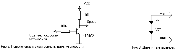 Автор разработки: Клочко Андрей Иренокович Схема принципиальная Цифровой спидометр, часы и термометр для автомобиляПредлагаемое устройство предназначено для измерения скорости, пройденного пути, температур снаружи и внутри автомобиля, а также температуры охлаждающей жидкости и напряжения аккумуляторной батареи. Схема собрана на широко распространенных элементах и содержит минимум деталей. Основой устройства является недорогой микроконтроллер АТ89С2051 [1] ф. Atmel, HEX - файл прошивки приведен. Результаты измерений доступны на шестиразрядном светодиодном индикаторе. По умолчанию при движении автомобиля отображается скорость, а в период остановки или стоянки – время. Другие измеряемые величины выбираются с помощью пяти кнопок по алгоритму, описанному далее. Кратковременное нажатие K1 включает фиксацию выбранного параметра на индикаторе, что подтверждается точкой в младшем разряде. Повторное нажатие выключает фиксацию и через 5 сек. восстанавливается исходный режим. Измеряемые значения выводятся на дисплей по кольцу в следующем порядке: Time (время), Count (счетчик пути), tout (наружная температура), tin (температура внутри), EnGinE (температура двигателя), UbАtt (напряжение аккумулятора). При нажатиях K2 просмотр происходит по полному кольцу, K3 начинает и заканчивает обзор с наружной температуры, а K4 – с температуры двигателя, что позволяет обойтись минимальным количеством нажатий. Быстро перейти в исходный режим (скорость или время), можно нажав кнопку K5. Переход от одного параметра к другому сопровождается кратковременным появлением названия величины и последующей индикацией ее значения. Чтобы обнулить счетчик пути необходимо зафиксировать его просмотр и нажать K4. Информация на индикаторе обновляется каждые полсекунды, при этом скорость выводится усредненной за последнюю секунду. Измерение температур и напряжения сопровождается «миганием» индикатора, что обусловлено алгоритмом работы АЦП. Схема блока процессора и АЦП представлена на рис 1. АЦП построено по упрощенному принципу, но дает вполне приемлемый результат преобразования. Его работа основана на сравнении внутренним компаратором МК измеряемого напряжения и линейно изменяющегося напряжения, образующегося на конденсаторе С9, заряжаемом через источник стабильного тока на элементах R4, R5, R6, R7, VD7, VT2. Цикл измерения начинается с разрядки конденсатора через порт контроллера и заканчивается в момент совпадения напряжений на входах AIN0 и AIN1. Продолжительность цикла измерения является величиной прямо пропорциональной измеряемому напряжению. Транзистор VT1 служит источником тока для датчиков температуры. Мультиплексор DD1 коммутирует аналоговые сигналы на вход компаратора микроконтроллера, а также стабильный ток на датчики температуры. Диоды VD1 - VD6 защищают входы схемы от случайных превышений напряжения. Конденсаторы С5 – С8 сглаживают пульсации источника питания VCC, при этом С5, С6 и С7 располагаются в непосредственной близости к цифровым микросхемам. Для хранения констант калибровки служит микросхема энергонезависимой памяти DD3 (АТ24С02 - АТ24С08). Объем памяти этой микросхемы больше требуемого, но дает возможность блочной записи (отечественный аналог РР1 почему-то такой возможности не дает). Алгоритм работы устройства позволяет использовать вместо АТ24С02 микросхему часов реаль