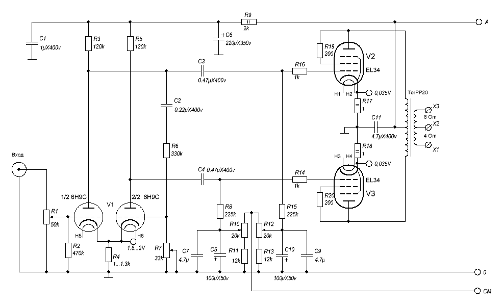 Двухтактный ламповый усилитель на 6П3С и 6Н9С внешний вид Настройка напряжения смещения и анодного напряжения для драйвераНастройка моноблока делается в режиме молчания по рекомендациям Манакова. Само собой, ко вторичной обмотке транса должна быть подключена активная нагрузка в виде проволочного резистора 4-8 Ом достаточной мощности (5-10 Вт). Далее настраивается входной каскад установкой напряжения 1.8…2 вольта на катодах драйвера 6н9с. Для этого нужно подобрать сопротивление резистора R4. Затем производим регулировку напряжение смещения для выходного каскада. С помощью переменных резисторов R10 и R12 устанавливаем на катодах выходных ламп напряжение 0,035…0,04 вольта. После чего подаем на сетку первого триода V1 сигнал с частотой около 3 кГц и напряжением 0,5 вольта. Регулируя переменный резистор R7, выставляем одинаковое переменное напряжение на анодах V1. После настройки усилитель продемонстрировал замечательное качество звучания и полное отсутствие посторонних шумов. Данный двухтакт выдает насыщенный и прозрачный звук с замечательными низами. Триодная схема включения может обеспечить приемлемую громкость для небольшой комнаты 4x4 метра. Самое главное, такой воздушный звук хочется слушать бесконечно, а громкость здесь отходит на второй план.