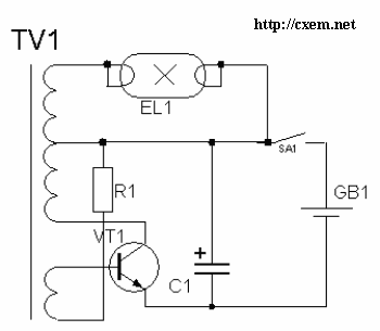 Принцип работы Данная схема представляет собой преобразователь напряжения по типу блокинг- генератора. Возбуждение в нем происходит из за обратной связи между коллекторной и базовой цепями транзистора посредством соответствующих обмоток трансформатора. Резистор R1 задаёт режим работы транзистора. После включения выключателя SA1 в верхней обмотке трансформатора появляется импульсное высокое напряжение, поступающее на лампу дневного света. Под воздействием ударной ионизац