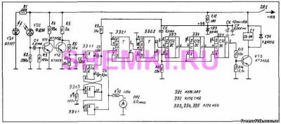 Автор разработки: И.Семенов Схема принципиальная Электронный расходомер топлива для двигателя внутреннего сгоранияПредлагаемый электронный расходомер позволяет контролировать мгновенный расход топлива, т.е. расход в данный момент, и общий расход. Расходомер с подобным принципом измерения выпускает американская фирма "FLOSCAN". Автором были проведены испытания датчиков с различными рабочими элементами. Предлагаемый датчик был признан лучшим и доступным для повторения. Датчик может обеспечить измерение мгновенного расхода топлива до 50 л/час. Точность измерения зависит от величины расхода, температуры и других факторов и составляет 4...10%, что соответствует уровню зарубежных образцов. Предел измерения 10 л/час был выбран исходя из конкретных условий работы двигателя. Основные технические характеристики измерителя: Напряжение питания 12 плюс-минус 2,5 В; Потребляемый ток 80мА; Предел измерения: - мгновенного расхода 10 л/час; - общего расхода 1000 л; Точность измерения мгновенного и общего расхода 4...10%; Дискретность измерения расхода 0,1 л; При калибровке датчика были получены исходные данные для измерителей мгновенного и общего расхода топлива. Калибровка была выполнена при максимальном расходе топлива 10 л/час, при этом частота следования импульсов датчика составила F = 111,111 Гц (Т=9мс). Дискретность измерения общего расхода выбрана равной 0,1 л, тогда за 1 с с датчика поступает 1,111 импульса, а за 1 час — около 4000 импульсов (3600*1,111 = 3999,6). Диапазон индикатора общего расхода СБ-1М составляет 10000 импульсов, что соответствует 1000 л израсходованного топлива. На основании полученных данных была построена схема измерителя мгновенного и общего расхода топлива, приведенная на рисунке. Положительный перепад напряжения, получаемый на резисторе R2 при "засветке" фотодиода VD2, через конденсатор С1 поступает на двухкаскадный (VT1, VT2) усилитель. Выходной сигнал с коллектора транзистора VT2 через согласующий делитель R6, R7 поступает на формирователь импульсов, выполненный на логическом элементе DD1. На логических элементах DD1.2, DD 1.3 собран ждущий мультивибратор, который вырабатывает импульс длительностью около 8 мс (при минимальном периоде входного сигнала равном 9 мс). Ждущий мультивибратор запускается продифференцированным цепочкой С3, R8 импульсом формирователя. С выхода элемента DD1.3 (вывод 10) сигнал через инвертор DD1.4 поступает на индикатор мгновенного расхода топлива, которым служит микроамперметр РА1. Среднее значение тока, протекающего через микроамперметр, прямо пропорционально частоте входных импульсов. Этот же сигнал с инвертора DD1.4 (вывод 11) поступает на вход делителя частоты с коэффициентом деления К = 4000. Деление на 4000 осуществляется последовательным соединением двух триггеров — DD2.1 и DD2.2 и трех счетчиков — DD3, DD4 и DD5. Выходной сигнал делителя частоты (DD5, вывод 2) через ключ VT3 включает электромагнитный счетчик Е1. Для питания микросхем серии К176 в устройстве предусмотрен стабилизатор напряжения R12, VD3. Конденсатор С5 предназначен для начальной установки в ноль счетчика при включении напряжения питания. Конденсаторы С2 и С7 нейтрализуют действие помех, приводящих к ложным срабатываниям счетчика. Индикатор мгновенного расхода топлива можно настроить и на другой предел измерения. Для этого необходимо подобрать резистор R9 или конденсатор С4, так чтобы дли