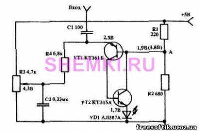 Автор разработки: В.Кульгавчук Схема принципиальная Индикатор ВЧ и НЧ напряженийИндикатор ВЧ и НЧ напряжений (в дальнейшем — индикатор) основан на использовании прибора с четырехслойной р-n-р-n структурой — транзисторного аналога однопереходного транзистора (ОПТ). Выгодным отличием описанного индикатора от других р-n-р-n приборов, например тиристоров, является то, что он сам выходит из проводящего состояния после прекращения входного сигнала. Транзисторный аналог образован соединением двух транзисторов p-n-р и n-p-п типов и двух резисторов R1 и R2, как показано на рисунке. Из рисунка видно, что коллекторный ток VT1 является базовым током VT2, а коллекторный ток VT2 — базовым VT1. Когда напряжение на эмиттере VT1 превысит напряжение в точке А, оба транзистора скачком перейдут в проводящее состояние (включатся). При этом из точки А потечет ток через транзисторы VT1 и VT2 и светодиод VD1 к общему проводу. С этого момента светодиод засветится, и напряжение в точке А понизится. Доля эмиттерного тока VT1 в общем токе через светодиод VD1 будет незначительна. При уменьшении напряжения на эмиттере VT1 уменьшится ток через эмиттер, и при определенной его величине оба транзистора перейдут скачком в закрытое состояние (выключатся), светодиод погаснет, а напряжение в точке А повысится до исходного. Гистерезис, т.е. разность между порогами включения и выключения, мал — около 0,3 В. Это позволяет использовать индикатор для регистрации ВЧ и НЧ напряжений, превышающих гистерезис. Индикатор снабжен переменным резистором R3, позволяющим изменять напряжение на эмиттере VT1, т.е. регулировать чувствительность. При напряжении на движке R3, близком к порогу выключения но не ниже его, чувствительность будет максимальной, а при снижении до нуля — минимальной. Включение индикатора происходит при напряжении на R3. равном 4,3 В, а выключение — при 4,0 В. Для расчета токов на рисунке указаны напряжения во включенном состоянии: на движке резистора R3. эмиттере VT1, светодиоде VD1 и в точке А; в скобках — в точке А в выключенном состоянии. Ввиду относительно высокой чувствительности индикатор используется для контроля по эфиру работы трансивера. Так, при работе на мощности около 30 Вт в диапазоне 40 — 10 м на антенну T2FD, подвешенную на расстоянии 15 м от трансивера и индикатора, последний регистрировал телеграфные посылки и работу SSB засвечиванием светодиода при подключении к выводу "Вход" в качестве антенны куска провода длиной около метра. При работе на антенну LW в диапазонах 160—10 м и расстоянии между антенной LW и индикатором, равном 1,5 м, CW и SSB регистрируются при уменьшении длины провода на входе индикатора до 15—20 см. Индикатор можно использовать для определения наличия генерации гетеродинов и генераторов при напряжении генерации более 0,3—0,4 В. При работе индикатора с НЧ необходимо увеличить емкость конденсатора С1. Работа индикатора проверялась в диапазоне частот от 20 Гц до 30 МГц. Индикатор регистрирует одиночные импульсы, например, помехи в электросети при включении и выключении электроприборов и освещения. Чувствительность индикатора оказывается достаточной для регистрации импульсов при наборе номера на телефонном аппарате. Для этого около телефонной линии размещают катушку индуктивности с большим числом витков, подключенную ко входу (С1 = 1 мкФ) и общему проводу. Источник: В.Кульгав