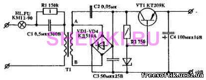 Автор разработки: В.Капуза Схема принципиальная Малогабаритный сетевой блок питанияДля питания и налаживания различных радиоэлектронных устройств с током потребления до 20 мА при напряжении 9 В предлагаю схему малогабаритного сетевого блока питания (БП). Все детали БП могут разместиться в корпусе размером 40x40x30 мм, т.е. непосредственно в сетевой вилке. Данные трансформатора: обмотка I содержит 1200 витков провода ПЭВ2 — 0,13 мм, обмотка II — 510 витков, провод ПЭВ21 — 0,18 мм. Магнитопровод — Ш 6x8 от карманных или переносных радиоприемников. С целью обеспечения безопасности с точки зрения поражения током электросети обмотки трансформатора тщательно изолируют друг от друга. Коммутаторная лампа КМ12-90 служит индикатором работы БП, а также предохранителем при пробое конденсатора С1. Выходное напряжение стабилизатора можно увеличить или уменьшить. Для этого необходимо применить другой стабилитрон VD5, соблюдая условие, чтобы ток через стабилитрон в целях экономии был в пределах 4 - 5 мА. Это достигается подбором резистора R1. Для устранения фона сети конденсатор С2 включается между точкой С и точкой А или Б. Надо заметить, что данный БП не боится короткого замыкания, что немаловажно при налаживании различных устройств. Источник: В.Капуза, журнал "Радиолюбитель". Схемы и статьи публикуются с разрешения редакции журнала.