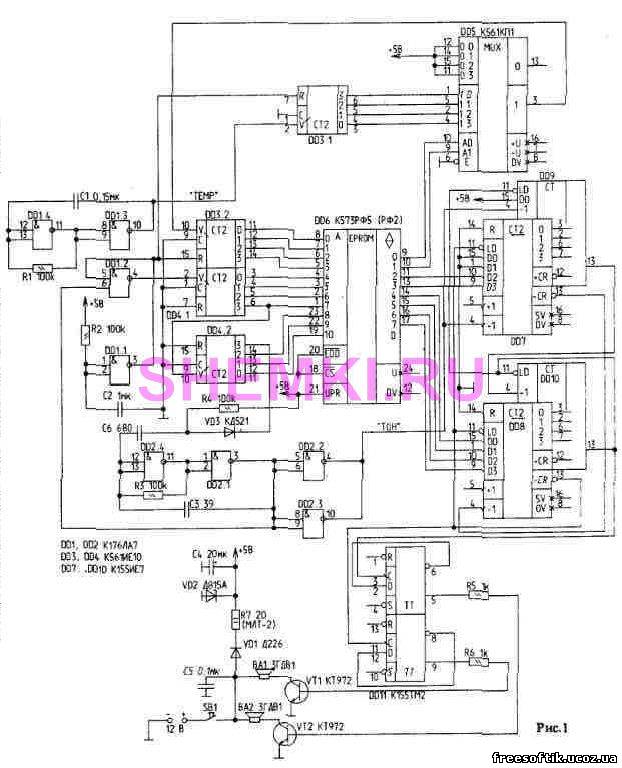 Автор разработки: А.Симутин Схема принципиальная Музыкальный автомобильный сигналКак показал опыт работы на всесоюзном рынке в течение 5 лет, музыкальные сигналы пользуются популярностью среди радиолюбителей. Конечно, возникает вопрос — где брать радиодетали? Они есть, главное — наличие денег. А какое нужно оборудование? Да никакого — нужны только электропаяльник, канифоль и припой, а главное — умелые руки. А как насчет корпуса изделия? Это совсем просто! Купите в магазине или на рынке два абонентских громкоговорителя, например, "Ритм-304", выпускаемых в г. Гомеле. Б один вставьте плату автосигнала "Сигма-94", а второй будет дополнительным. Динамические головки пойдут "родные", но с сопротивлением не менее 8 Ом. Переходные трансформаторы необходимо отключить, в некоторых случаях обмотку трансформатора (толстый провод) можно соединить последовательно с динамической головкой. Это повысит надежность работы динамиков. При контрольной проверке вышеописанных динамиков мелодии были слышны на расстоянии до 200 метров (при открытом капоте автомобиля). В "Сигме-94" (рис.1) только 6 разрядов используются для деления частоты тона, а 2 младших разряда управляют работой тактового генератора, повышая "узнаваемость" мелодий. С6, VD3, R4 по случайному закону изменяют тональность мелодий на одну октаву. В качестве стабилизатора применен стабилитрон и балластный резистор. Стабилитрон (можно использовать Д815Б) устанавливать на радиатор не обязательно. Двухваттный резистор R7 (200м) греется достаточно сильно, но работает даже при прослушивании всех мелодий подряд. На рис.2,3 приведены монтажная и печатная платы.![]()