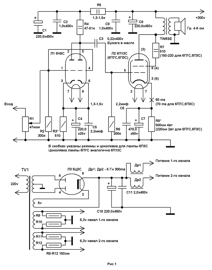 Автор разработки: Вадим Пузанов, г.Брянск Схема принципиальная Однотактный ламповый усилитель на 6П3СПредставленная схема усилителя не нова, и достаточно широко известна, можно сказать это классика одно- тактовых ламповых усилителей. Но у нее есть ряд особенностей, делающую ее привлекательной, так как она относительно проста и может быть повторена даже начинающими радиолюбителями, но в тоже время обеспечивает отличное качество звучания. Схема лампового унч на 6П3С Принципиальная схема усилителя представлена на рис.1