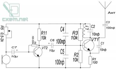 Автор разработки: Виталий Схема принципиальная Простой и хороший FM жучекЭтот жучек состоит из двух основных частей: передатчика и микрофонного усилителя. Первая часть собрана на транзисторе VT1 и колебательном контуре L1 - C2. На транзисторе VT2 собран простейший микрофонный усилитель. Сам жучек есть простенький, но при правильной настройке дает очень даже не плохой результат роботы. Это устройство можно использовать для прослушки на небольших расстояниях (около 50-100м). Это если ловить китайским приемником, если слушать телефоном или сканером, то дальность приема уменьшиться приблизительно на 50 метров! Технические характеристики жучка: Расстояние приема – (50 – 100м) Напряжение питания – 3 – 12в Употребляемый ток (3-5 мА) Тип модуляции (частотная) Рабочая частота (88-108МГц. Жучек состоит из небольшого количества элементов. Все детали подобраны так, чтобы их можно легко купить. Схема состоит из передатчика и микрофонного усилителя. Резистор R1 – ограничивает ток поступающий на транзистор. Колебательной контур C2–L1 - задет частоту самого жучка. На транзисторе VT2 – собран микрофонной каскад усиления, что позволяет услышать даже тихий шепот. Подстроечный резистор R5 регулирует чувствительность микрофона. Обязательное условие – R3 = R2. Что бы собрать этот жучек нам понадобится: Резистор на 100 Ом Резистор на 10 кОм – 3 шт. Резистор на 330 кОм Резистор на 2 кОм (подстроечный) Конденсатор на 102 пФ -3 шт. Конденсатор на 10 мкФ -2 шт. Конденсатор на 10 пФ 2 шт. Транзистор КТ315 – 2 шт. Медная проволока диаметром 0.3мм - 10см. Медная проволока диаметром (0.5-1мм) – для антенны. Микрофон электретный 1шт типа «сосна». Припой, канифоль, паяльник. Резисторы R2 –R3 – можно повысить номиналы примерно на 5 кОм, но они должны быть одинаковыми. Конденсаторы C5 - C4 можно увеличить до 400 пФ, но частота изменится. Транзистор VT1 можно заменить на КТ368, или на С9018 , при этом дальность увеличится. Транзистор VT2 можно заменить КТ3102, или ВС547, на чувствительность микрофона это почти не повлияет. Настраивать жучек достаточно просто. Включаешь радиоприемник , ставишь где то 1-2 м от устройства. Если при включении звук изменился – работает! Потом ищем частоту, на какой будет слышно твой голос. Отходишь от жучка и ищешь частоту, на какой дальность приема самая большая, потому, что он имеет множество «фальшивых частот», дальность приема на каких не превышает 15 метров. Потом надо наладить чувствительность микрофона, подстроечным резистором регулируем, пока слышимость не будет максимальная. Так же вместо конденсатора C2 можно поставить подстроечный конденсатор 8 …32 пФ. Крутя головкой конденсатора можно изменять частоту генерации жучка. Настраивать частоту можно сдвиганием – раздвиганием витков катушки L1. Скачайте прикрепление к "Простой и хороший FM жучек"