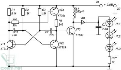 Автор разработки: Дмитрий Кокойло Схема принципиальная Простой LED фонарь из доступных компонентовПредлагаю вниманию простую в повторении, но имеющую неплохие характеристики, схему светодиодного фонарика, к тому-же не требующей микросхем, и иных труднодоступных компонентов.Схема представляет собой обычный повышающий стабилизатор – бустер. Особенностью является задающий генератор, аналога мне найти не удалось, фактически это гибрид мультивибратора и мультивибратора с активной нагрузкой. В результате получился генератор, способный работать в широком диапазоне напряжения питания, начиная с 1В., имеющий низкое выходное сопротивление, и как следствие способный отдать в нагрузку значительный ток (вытекающий ток ограничен максимальным током коллектора VT4). Кроме того, он экономичен - ток потребления около 2,5 мА., и имеет ровный прямоугольный сигнал на выходе с короткими фронтами. На рисунке № 1 приведена схема исходного варианта, в ней не предусмотрено стабилизация тока через светодиоды. Частота генерации порядка 45 кГц, КПД около 80%, ток нагрузки регулируется подбором R2. Конструкция и детали: схема рассчитана на начинающих радиолюбителей, получилась абсолютно не требовательна к деталям, в качестве VT1, VT2 и VT4 подойдут любые средне или высокочастотные транзисторы соответствующей проводимости, с коэффициентом усиления не менее 100. Дроссель может иметь любую конструкцию, индуктивность некритична и может иметь значительный разброс. В авторском варианте применялись две конструкции. Первый на сердечнике СБ 14 из феррита 2000НМ с зазором 0,2 мм., провод диаметром 0,25 мм. до заполнения каркаса. Второй на ферритовом 2000НМ стержне диаметром 2 мм длинной 30мм, намотка в три слоя тем же проводом, длинна намотки приблизительно 2 см, каждый слой крепился с помощью "суперклея". При изготовлении или подборе готового дросселя необходимо обращать внимание на сопротивление обмотки, чем ниже, тем лучше. В качестве VT3 желательно выбирать ключевые транзисторы с низким напряжением насыщения, хотя преобразователь работает с любым транзистором, но страдает КПД. Диод поставил первый попавшийся импульсный – КД522, при наличии малогабаритного Шотки еще лучше. Конденсатор С3 – керамический, если есть возможность увеличить до 1 мкФ то желательно поставить – не помешает. Несколько слов о R6, он, конечно немного портит КПД но зато позволяет снизить броски тока через светодиоды, если их не жалко то можно его исключить. Настройка: после сборки устройство, если монтаж выполнен без ошибок, начинает работать сразу, однако ток нагрузки необходимо проверить и отрегулировать. Регулировка заключается в изменении сопротивления резистора R2. Настройку производят при максимально возможном напряжении питания, по мере снижения Uпит. ток, и соответственно яркость светодиодов будет снижаться. На рисунке №2 приведена схема со стабилизацией выходного тока, для этого в схему введен дополнительный транзистор, и увеличен номинал R6. Конструкция и работа схемы аналогична вышеописанной. Настройка имеет особенности связанные с наличием цепи стабилизации. Вначале отключив стабилизацию тока, например не впаивая VT5, при минимальном Uпит выставляем, как описано выше, номинальный ток светодиодов. Затем, задействовав стабилизацию, при максимальном Uпит снова его устанавливаем, но уже подбо