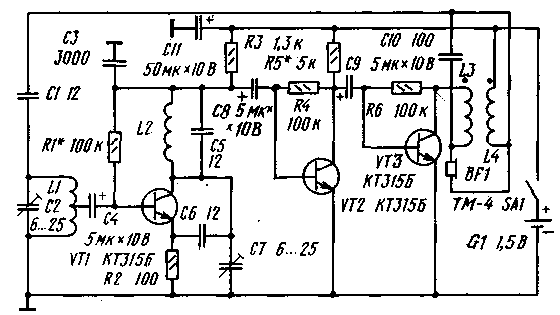 Автор разработки: abrosov2012 Схема принципиальная Простой УКВ ЧМ приемникПредлагаемый читателям УКВ ЧМ приемник (см. рисунок) выполнен на базе радиоприемного устройства прямого преобразования с ФАПЧ, разработанного в свое время радиолюбителем из Краснодара А. Захаровым (см. "Радио", 1985, № 12, с. 28-30). Радиочастотный каскад приемника собран на транзисторе VT1 и представляет собой преобразователь частоты с совмещенным гетеродином, выполняющий одновременно функции синхронного детектора. Антенной приемника служит провод головного телефона. Принятый ею сигнал радиовещательной станции поступает на входной контур L1C2, настроенный на среднюю частоту принимаемого УКВ диапазона (70 МГц) и далее на базу транзистора VT1. Как гетеродин, этот транзистор включен по схеме ОБ, а как преобразователь частоты - по схеме ОЭ. Гетеродин перестраивается в диапазоне частот 32,9...36,5 МГц, так что частота его второй гармоники лежит в границах радиовещательного УКВ диапазона (65.8...73 МГц). Контур L2C5 настроен на частоту вдвое меньшую, чем входной контур L1C2, а поскольку преобразование происходит на второй гармонике гетеродина, разностная частота оказывается лежащей в звуковом диапазоне частот. Усиление сигнала разностной частоты обеспечивает тот же транзистор VT1, который, как синхронный детектор, включен по схеме ОБ. Усилитель 3Ч приемника двухкаскадный. Каскад предварительного усиления выполнен на транзисторе VT2, а каскад усиления мощности - на транзисторе VT3. Прослушивают принятые передачи на головной телефон BF1 (ТМ-4). Выходная мощность усилителя 3Ч на нагрузке сопротивлением 8 Ом при питании от одного элемента А332 (1,5 В) - 3 мВт, что вполне достаточно для работы на головной телефон. Ток, потребляемый приемником от источника питания, не превышает 10 мА. Приемник можно собрать в любом малогабаритном корпусе. Монтаж навесной. Резисторы - МЛТ-0,125, ок-сидны.е конденсаторы - К50-6, подстроечные - любые с воздушным диэлектриком, остальные КМ, КЛС. Катушки L1 и L2 бескаркасные. Внутренний диаметр намотки - 5, шаг - 2 мм. Катушка L1 содержит 6 (с отводом от середины), а L2 - 20 витков провода ПЭВ-2 0,56. Катушки L3, L4 содержат по 200 витков провода ПЭЛ 0,06. Их наматывают на ферритовом (М400НН) стержне диаметром 2 и длиной 10 мм в два провода. Транзистор VT1 можно заменить на КТ3102Б, при этом чувствительность приемника повысится. Налаживание приемника начинают с усилителя 3Ч. Режим работы транзисторов VT2, VT3 устанавливают подбором резистора R5 до получения коллекторного тока покоя транзистора VT3, равного 6...9 мА. Режим гетеродина регулируют подбором резистора R1, уровень второй гармоники гетеродина - конденсатора С6. Границы принимаемого диапазона частот устанавливают изменением индуктивности катушки L2. Входной контур настраивают конденсатором С2, ориентируясь на максимальную полосу удержания сигналов принимаемых радиостанций. По диапазону приемник перестраивают конденсатором С7. Рекомендации по настройке: C7 особо не крутить. Вместо этого ловить станцию изменением длины (индуктивности) катушки L2. Конденсатор C2 служит для точной настройки. Когда поймали станцию, то крутите C2, пока звук не станет понятным. Да и возможно, придёться подобрать питание приёмника. Так-как 1,5В указанных на схеме, в моём случае было не достаточно. Запитал примерно от 7 Вольт. Можно ещё добавить антену к нижнему по схеме, выводу конденсат