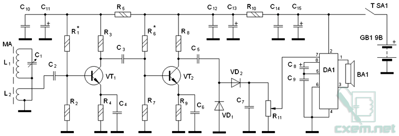 Приемник (см. рисунок ниже) состоит из магнитной антенны МА, двухкаскадного усилителя радио частоты (УРЧ), амплитудного детектора и усилителя звуковой частоты (УЗЧ) на микросхеме.