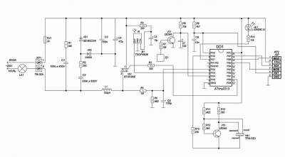Автор разработки: Баталов Алексей Схема принципиальная Сенсорный регулятор освещения с дистанционным управлениемПредлагаемое устройство — один из вариантов микроконтроллерных регуляторов яркости ламп накаливания, конструкции которых можно найти во всемирной сети интернет и в радиолюбительской литературе. В подобных регуляторах обычно используется один из трёх способов управления: от собственного пульта; от любого пульта с запоминанием кода клавиши; от любого пульта при нажатии любой клавиши определенным образом. В данном случае выбран первый вариант, который я считаю наиболее удачным, несмотря на то, что требуется отдельный пульт управления. Немного поясню почему. Поскольку разные системы ИК управления имеют различную несущую частоту модуляции, то они также могут различаться в произвольно используемой паре ”пульт - регулятор”, вследствие чего дальность управления может сильно уменьшиться, что вызывает некоторые неудобства. Недостатком последнего способа так же является и то, что регулятор может реагировать на команды, которые ему вовсе не предназначены или же регулирование затруднено вследствие сложных манипуляций клавишей пульта. Управление предлагаемым регулятором осуществляется двумя кнопками любого пульта ДУ, работающего с широко распространённой системой команд RC-5. Пульты этой системы достаточно доступны и дешевы. Функции, выполняемые регулятором: дистанционное включение и выключение света, регулировка яркости освещения; местное включение, выключение и регулировка яркости освещения с помощью сенсора, который не имеет гальванического контакта с человеком при касании; плавное включение освещения, что продлевает срок службы лампы накаливания запоминание предыдущей установки яркости лампы и состояния регулятора. Благодаря динамическому использованию EEPROM для этих функций, ресурс на количество манипуляций управления регулятором составляет не менее 5,4 млн. раз. автовыключение через 12 часов, которое используется для забытого включенного света; Управление регулятором: Ручное (сенсорное) управление осуществляется касанием всей ладонью или сложенными вместе четырьмя пальцами сенсора без усилия. Включение или выключение освещения - однократное кратковременное касание сенсора (0,5 - 1 сек.). Регулировка яркости освещения - удержание ладони на сенсоре более 1 сек. Каждое следующее длительное касание вызывает противоположное направление изменения яркости. Дистанционное управление осуществляется пультом ДУ, направленным в сторону выключателя. Для управления регулятором определяются две клавиши пульта. Выключение или включение освещения - однократное кратковременное нажатие соответствующей клавиши пульта (0,1-1 сек.). Регулировка яркости освещения - удержание нажатой клавиши более 1 сек. Коды кнопок пульта ДУ, соответствующие этим командам, хранятся в ЕЕРRОМ микроконтроллера. Благодаря этому в режиме обучения (который описан в инструкции) можно в любой момент изменить набор кнопок пульта, которыми осуществляется управление регулятором. Устройство регулятора: Регулятор построен на недорогом и доступном микроконтроллере АТtiny2313-20SU. Принципиальная схема устройства приведена ниже. Узел питания состоит из элементов С2, R2,VD1, VD2, C3, C4 служит для обеспечения микроконтроллера и ИК-приемника напряжением пит