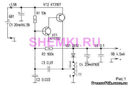 Автор разработки: А.Николаев Схема принципиальная Стабилизированный преобразователь напряженияПрименяемые в пультах дистанционного управления (ПДУ) батарейки типа "Крона" имеют малый срок службы. Поэтому целесообразно использовать элементы типа A316 «А316 вместо батарейки КРОНА - схемы, описания, справочные материалы»с напряжением 1,5 В совместно с преобразователем напряжения. Преобразователь (рис.1) представляет собой однотактный релаксационный генератор с емкостной положительной обратной связью (С2, С3). В коллекторную цепь транзистора VT2 включен повышающий автотрансформатор Т1. В преобразователе использовано обратное включение выпрямительного диода VD1, т.е. при открытом транзисторе VT2 к обмотке автотрансформатора приложено напряжение питания Un и на выходе автотрансформатора появляется импульс напряжения. Однако включенный в обратном направлении диод VD1 в это время закрыт, и нагрузка отключена от преобразователя. В момент паузы, когда транзистор закрывается, напряжение на обмотках Т1 изменяется на обратное, диод VD1 открывается и выпрямленное напряжение прикладывается к нагрузке. При последующих циклах, когда транзистор VT2 запирается, конденсаторы фильтра (С4, С5) разряжаются через нагрузку, обеспечивая протекание постоянного тока. Индуктивность повышающей обмотки автотрансформатора Т1 при этом играет роль дросселя сглаживающего фильтра. Для устранения подмагничивания сердечника автотрансформатора постоянным током транзистора VT2 используется перемагничивание сердечника автотрансформатора за счет включения параллельно его обмотке конденсаторов С2 и С3, которые одновременно являются делителем напряжения обратной связи. Когда транзистор VT2 закрывается, конденсаторы С2 и С3 в течение паузы разряжаются через обмотку 1-2, перемагничивая сердечник T1 током разряда. Время открытого состояния транзистора VT2 определяется индуктивностью обмотки 1-2 автотрансформатора Т1 и емкостями С2 и С3. Частота генерации зависит от напряжения на базе транзистора VT1. Стабилизация выходного напряжения осуществляется за счет ООС по постоянному напряжению посредством R2. При этом при понижении выходного напряжения увеличивается частота генерируемых импульсов при примерно одинаковой их длительности. В результате увеличивается частота подзарядки конденсаторов фильтра С4 и С5 и падение напряжения на нагрузке компенсируется. При увеличении выходного напряжения частота генерации наоборот уменьшается. Так, после зарядки накопительного конденсатора в ПДУ частота генерации падает в десятки раз. Остаются лишь редкие импульсы, компенсирующие разрядку конденсаторов в режиме покоя. Этот способ стабилизации позволил довести ток покоя преобразователя до 0,5 мА. Детали. Транзисторы VT1 и VT2 должны иметь возможно больший коэффициент усиления для повышения экономичности. Обмотка автотрансформатора намотана на ферритовом кольце 2000 НМ 10 x 6 x 2 мм и имеет 300 витков провода ПЭЛ-0,08 с отводом от 50-го витка (считая от "заземленного" вывода). Диод VD1 должен быть высокочастотным и иметь малый обратный ток. Остальные детали — малогабаритные, любых типов. Печатная плата приведена на рис.2. После монтажа и настройки детали преобразователя закрываются экраном, изготовленным из белой жести.![]()