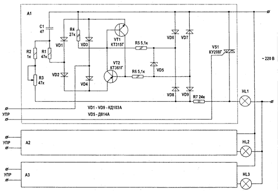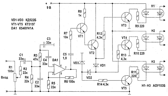 Приведена схема самой примитивной цветомузыкальной установки на три канала. Данная ЦМУ включает простейшие пассивные фильтры на RC элементах, сигналы с выхода которых управляют тиристорными ключами. Излучатели питаются от источника постоянного напряжения 220 В. Верхним по схеме является фильтр НЧ, настраиваемый на частоту 10