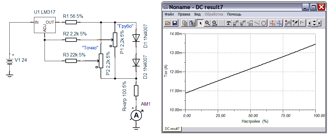 Автор разработки: Сергей Скворцов Схема принципиальная Задатчик тока 4-20 мА для наладки систем автоматизации.Нередко при использовании задатчика возникает необходимость устанавливать конкретное значение тока с точностью до единиц/десятков микроампер или, например, плавно изменять ток в небольших пределах. То есть, выполнять так называемую грубо-точную регулировку. В нашей схеме на Рисунке 9 это просто сделать установкой последовательно с потенциометром Р1 дополнительного переменного резистора с номиналом примерно в десять раз меньшим, чем у Р1. Он будет выполнять функции точной регулировки. Но не всегда переменный резистор нужного номинала есть под рукой. Тогда простым решением может быть такая схема:
