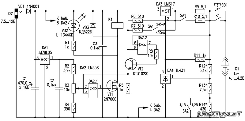 Автор разработки: vyachko Схема принципиальная Зарядное устройство для литиевых аккумуляторовАккумуляторы на основе лития (литий-ионные, а позднее и литий-полимерные) благодаря высокой энергетической плотности, низкому саморазряду и отсутствию т.н. эффекта памяти в настоящее время получили широкое распространение в качестве источников питания для портативных электронных устройств, количество которых с каждым годом только растёт. При всех положительных свойствах есть у литиевых аккумуляторов и недостатки, одним из них является высокая чувствительность к превышению напряжения заряда. Так, допуск на величину напряжения заряда составляет всего несколько десятком милливольт (обычно 50мВ) и превышение напряжения свыше допустимого может привести к нагреву и интенсивному газообразованию. А поскольку аккумуляторы имеют герметичную конструкцию, избыточное выделение газа может приводить к взрыву. К тому же литиевые аккумуляторы очень плохо переносят перезаряд (даже малым значением зарядного тока). При эксплуатации аккумуляторов в "родных" устройствах благодаря использованию специализированных микросхем для контроля заряда проблем с зарядом практически не возникает. Но при использовании литиевых аккумуляторов в различных самоделках возникает вопрос, как и чем заряжать такие аккумуляторы. Некоторые ошибочно считают, что литиевые аккумуляторы уже содержат встроенные контроллеры заряда, но это не так, на самом деле в некоторые аккумуляторы встроены схемы защиты, такие аккумуляторы называют защищёнными (Protected Rechargeable Lithium Battery). Схемы защиты в таких аккумуляторах предназначены в основном для защиты от глубокого разряда и превышения напряжения выше 4,25В, т.е. это аварийная защита, а не контроллер заряда. Можно конечно использовать специализированные микросхемы для контроля за процессом заряда литиевых аккумуляторов, например LTC1734 , LTC4054 (использовались в некоторых моделях сотовых телефонов SAMSUNG) или MAX1555 и им подобные, но не всегда такие микросхемы можно купить в свободной продаже. Поэтому у многих и возникает желание собрать подобное устройство из доступной "рассыпухи". В сети Internet можно найти несколько схем простых зарядных устройств для литиевых аккумуляторов. Пожалуй, самой распространённой в настоящее время является схема с использованием "тандема" двух интегральных стабилизаторов LM317 и TL431 [1]. Но отсутствие функции автоматического выключения заряда рано или поздно приведёт к перезаряду аккумулятора, а это отрицательно скажется на его сроке службы, к тому же желательно иметь возможность выбирать верхнее значение напряжения заряда (4,1В для аккумуляторов на 3,6В и 4,2В для аккумуляторов на 3,7В). В другой схеме [2] введено автоматическое отключение заряда, но схема "заточена" под аккумулятор какой-то конкретной ёмкости, также в этой схеме исключена стабилизация тока и отсутствует выбор напряжения. В общем, было решено взять за основу схему с LM317 и TL431 и немного дополнить её. Приведу для информации рекомендации по выполнению зарядки одного из производителей литиевых аккумуляторов (Panasonic): 1 этап – заряд стабильным током величиной 0,2С…1C (C – ёмкость аккумулятора); 2 этап – заряд стабильным напряжением, равным максимально допустимому для конкретного типа аккумуляторов (4,1В или 4,2В). Сигналом окончания заряда служить снижение тока 