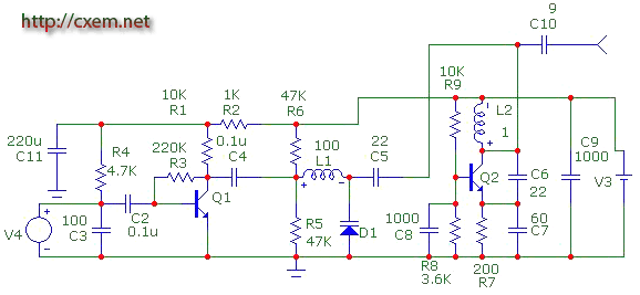 Схема принципиальная Жук на 350мХарактеристики и передатчика: дальность 180м при питании 4в и 350м при УВЧ питание:1,5...12в передатчик передаёт сигнал с частотной модуляцией при хорошей чувствительностью микрофона антенна - кусок провода длиной 60см Детали: транзистор Т1 можно исключить а на С4 подавать НЧ сигнал варикап-любой транзисторы-Т1 КТ3102Е,Т2-КТ368 или S9018 дроссель L1 на 100мкг катушка L1 4вит проводом 0,5мм на каркасе 5мм дополнение к передатчику усилитель мощности!!! усилитель мощности с П-контуром L1-5вит тем же проводом L2-5вит тем же проводом транзистор-КТ610 Мощность-0,6вт если большая мощность не требуется надо поставить вместо КТ610 на КТ368 катушку L2 в задающем генераторе зашунтировать емкостью 15пф Описание: сигнал с микрофона выделяется на резисторе R4 и поступает через конденсатор С2 на базу однокаскадного усилителя на транзисторе Т1 смещения транзистора задаёт резистор R3 его подбирают чтобы на коллекторе Т1 было половина напряжения питания НЧ сигнал выделяется на резисторе R1 и Дале через конденсатор С4 идёт на варикап резисторы R5 R6 нужны для смещения варикапа варикап тем самым осуществляет ЧМ потому что он изменяет ёмкость при сигнале и это влияет на частоту задающего генератора. Задающий генератор обычный трёхточка конденсатор С3 необязателен он был напаян на самом микрофоне резистор R2 и конденсатор С11 и L1(это дроссель) образуют фильтр чтобы ВЧ не проникала на УНЧ и не нарушала его работу мощность ЗГ 200мвт(при 6в) дальность при усилителе мощности на КТ610 и при хорошей антенне достигала 3км конденсаторы С3 С4 С5 С10 отфильтрируют постоянную составляющую от переменной С3 С4(В усилителе мощности!) подбирать для настройки П-контура![]() ![]()